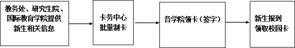 1、新生入学校园卡办理:卡务中心根据教务处、研究生院、国际教育学院提供的新生、留学生名单集中办理。在新生入学前,各学院统一到卡务中心领取校园卡,新生入学时可在学院报到处免费领取首张校园卡。再次补卡需收取工本费13元。