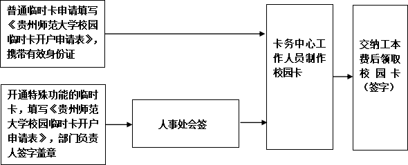 临时卡需开通特殊功能的(如:享受免费乘车或享受免费中餐),由申请人填写《贵州师范大学校园卡开户申请表-临时卡》,并由所在部门负责人签字、盖章,附相关证明材料(如用工合同、身份证复印件等)报人事处会签后,方可到卡务中心办理。申请临时卡须缴纳制卡工本费13元。