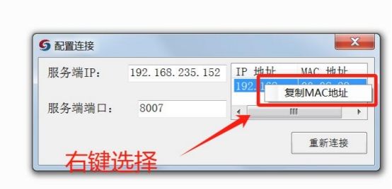 2、点击【已连接】或【未连接】,弹出如下配置连接框(反应稍慢,需等待),右击如下MAC地址,点击【复制MAC地址】即可。